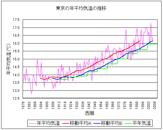 不規則に上下動を繰り返しますが、上昇傾向をはっきりと読み取ることができます。移動平均Aは単年の不規則変動を除去した30年移動平均線です(30年移動平均では前後に15年ずつのデータを必要とするので、両端の15年は計算できません)。こちらを見ると大正時代(1912-1926)に線が上向きに転じ、以後、着実に温暖化が進んでいるのが分かります。